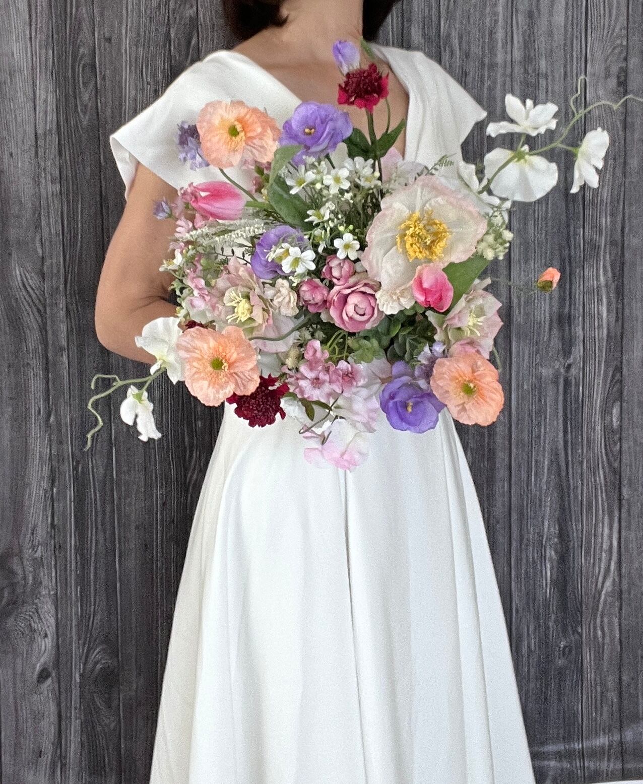 特別な日を彩るウエディングブーケをお届けします。ふわふわとした質感が可愛い、キュートなデザインが魅力です。高品質のアーティフイッシャルフラワーを使用しておりますので、特別な日の思い出を長く残し、インテリアとして飾っていただくこともできます。花びらひとつひとつまで丁寧に作られた花々が豪華で上品な印象をあたえます。